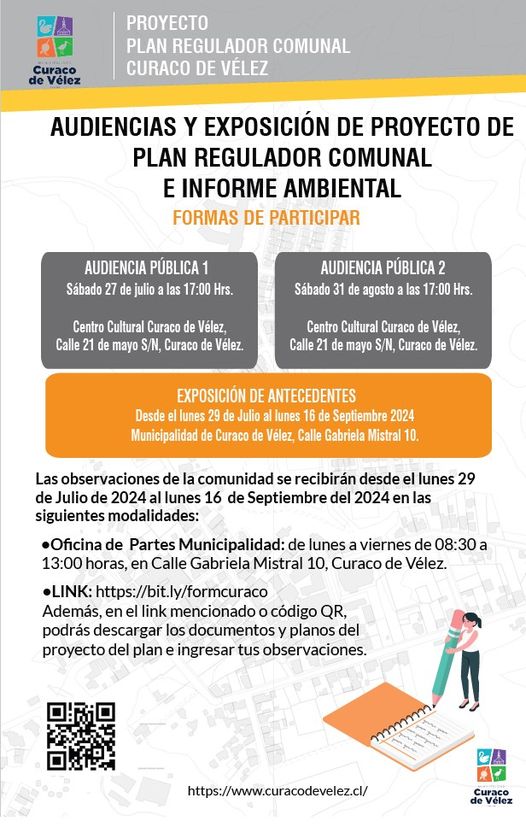 La Ilustre Municipalidad de Curaco de Vélez informa que, con motivo de presentar a la comunidad el Proyecto de Plan Regulador Comunal e Informe Ambiental, se realizará la segunda audiencia pública abierta a la comunidad.